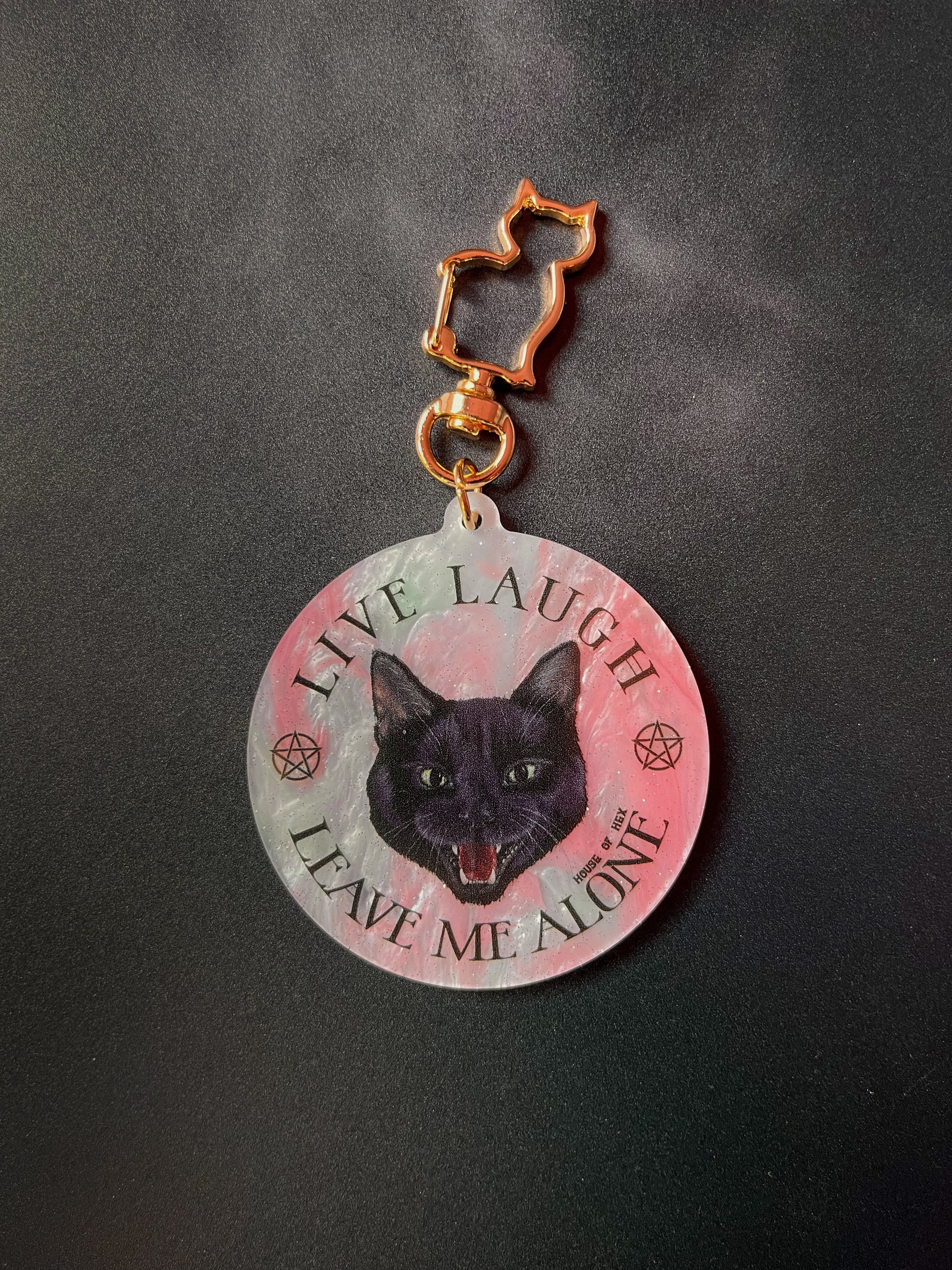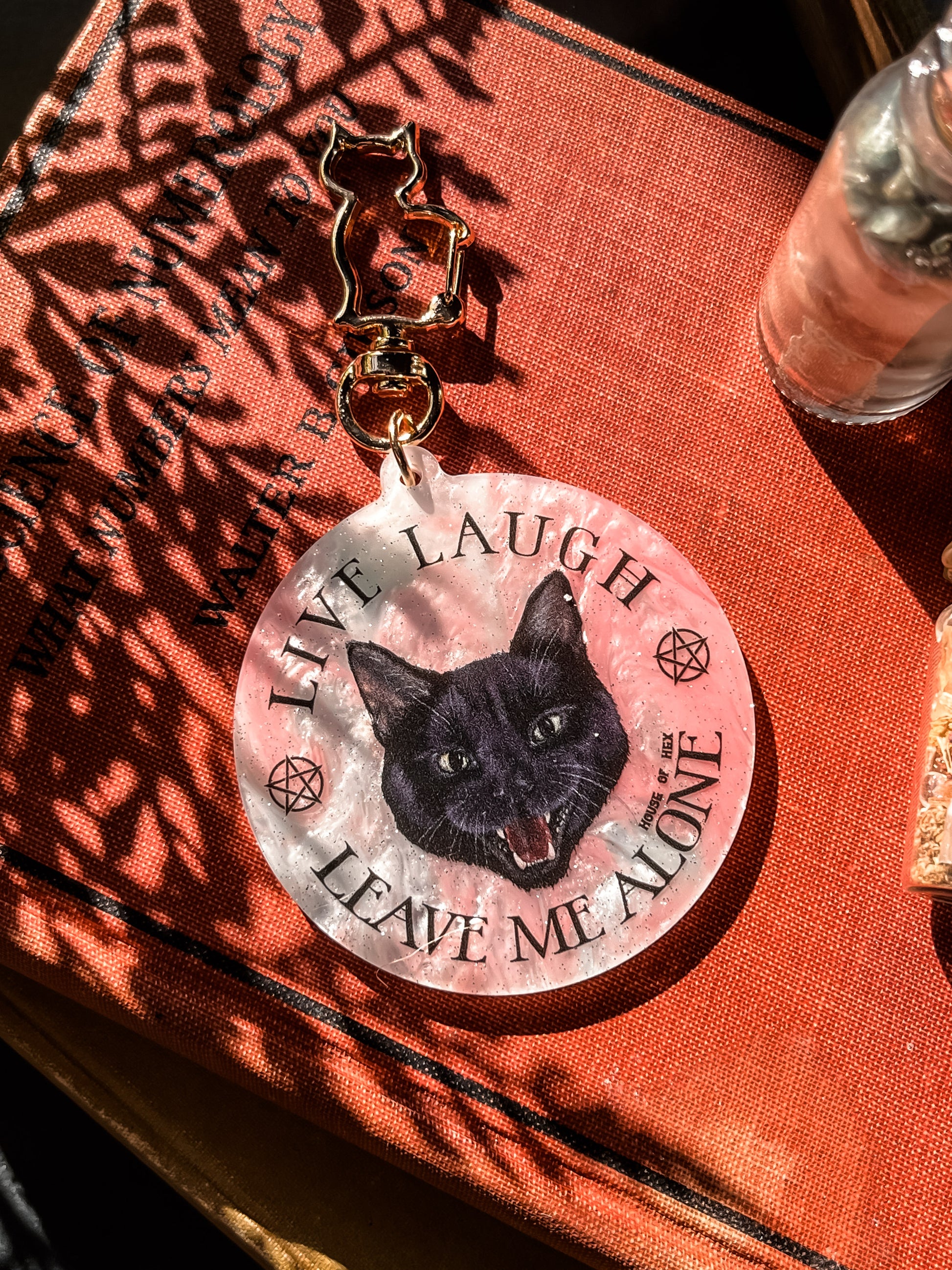Take this mischievous feline friend with you wherever you wander and add a playful dash of spookiness to your day. Featuring a drawn Black Cat and Live Laugh Leave Me Alone in writing.
