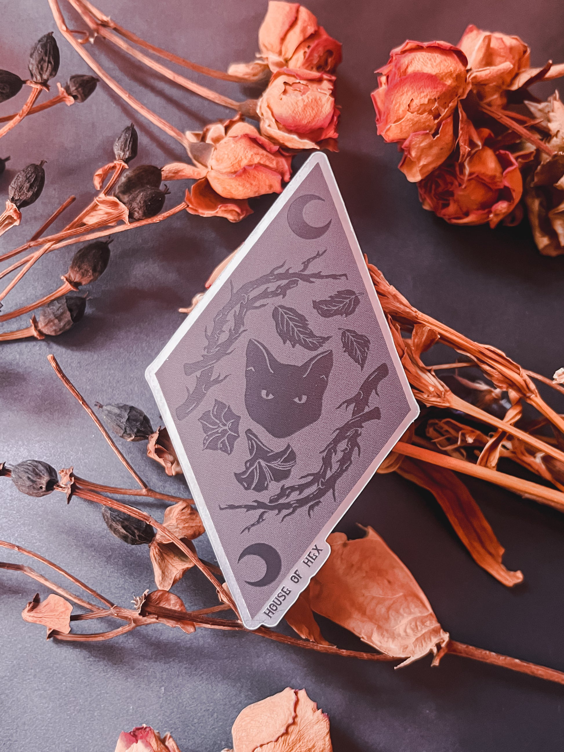 Featuring a painted cat with thorns, poisonous flowers, and moons