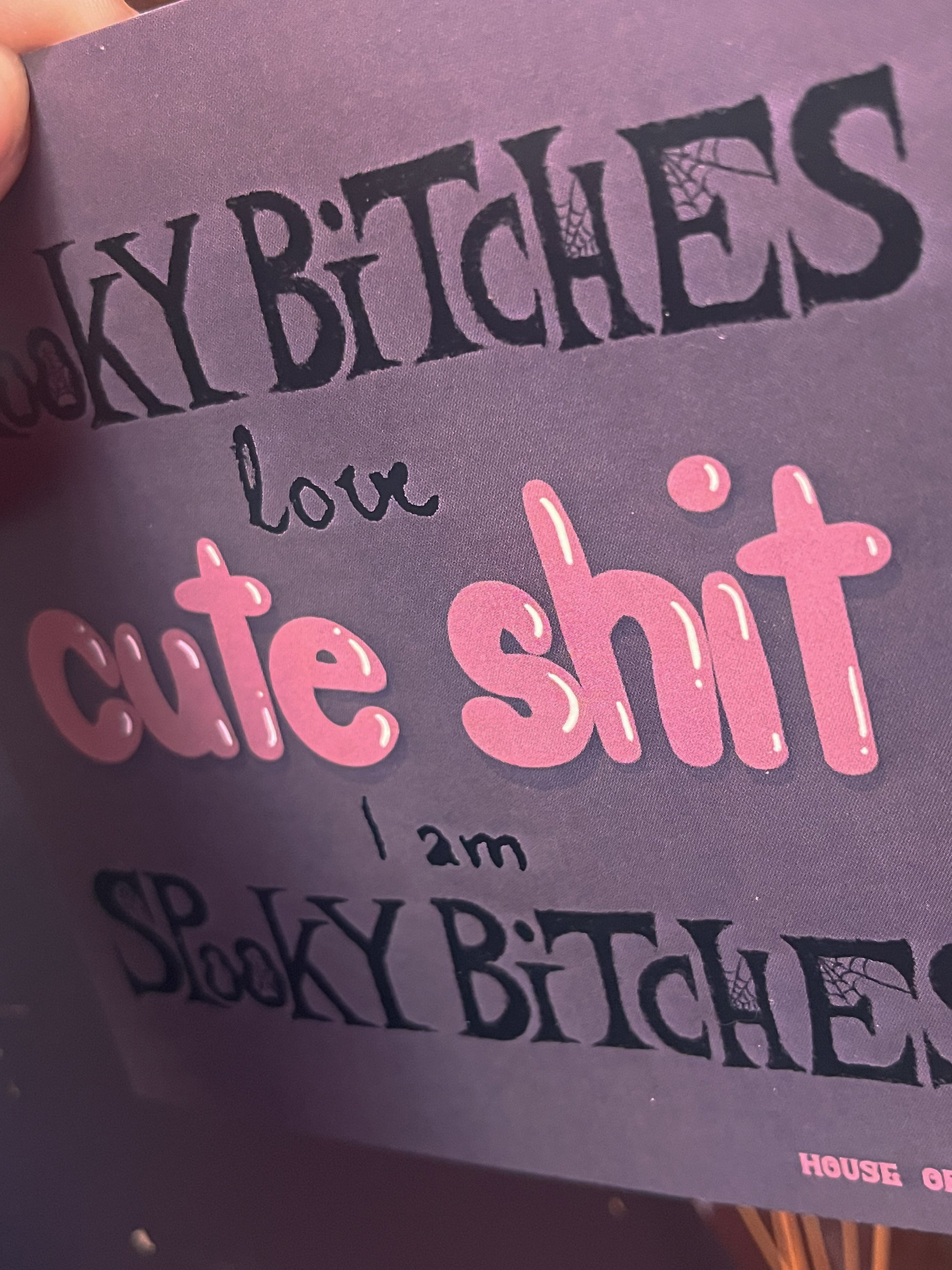 Print features the writing "spooky b!tches love cute sh!t, I am spooky B!tches" on lilac background