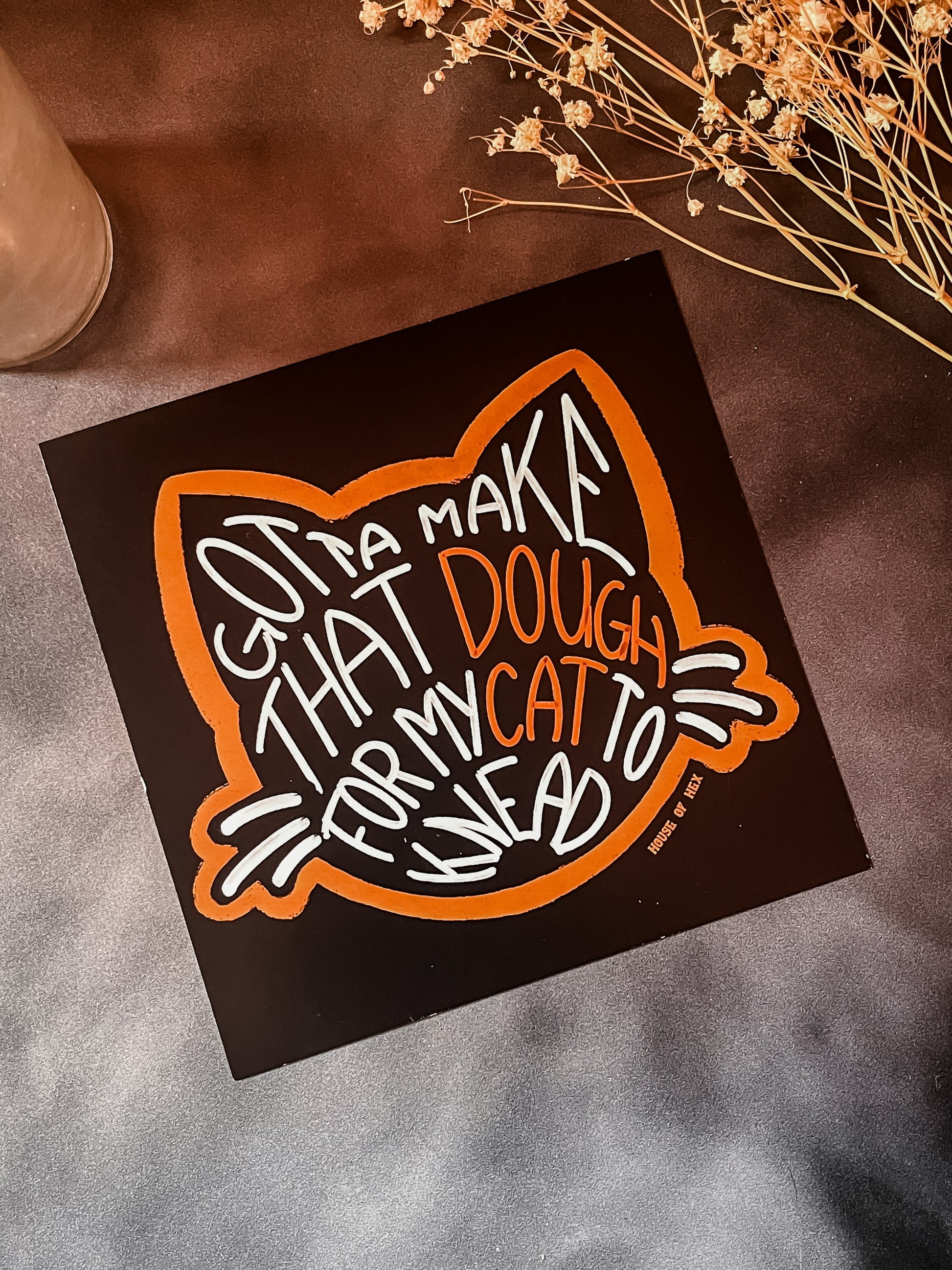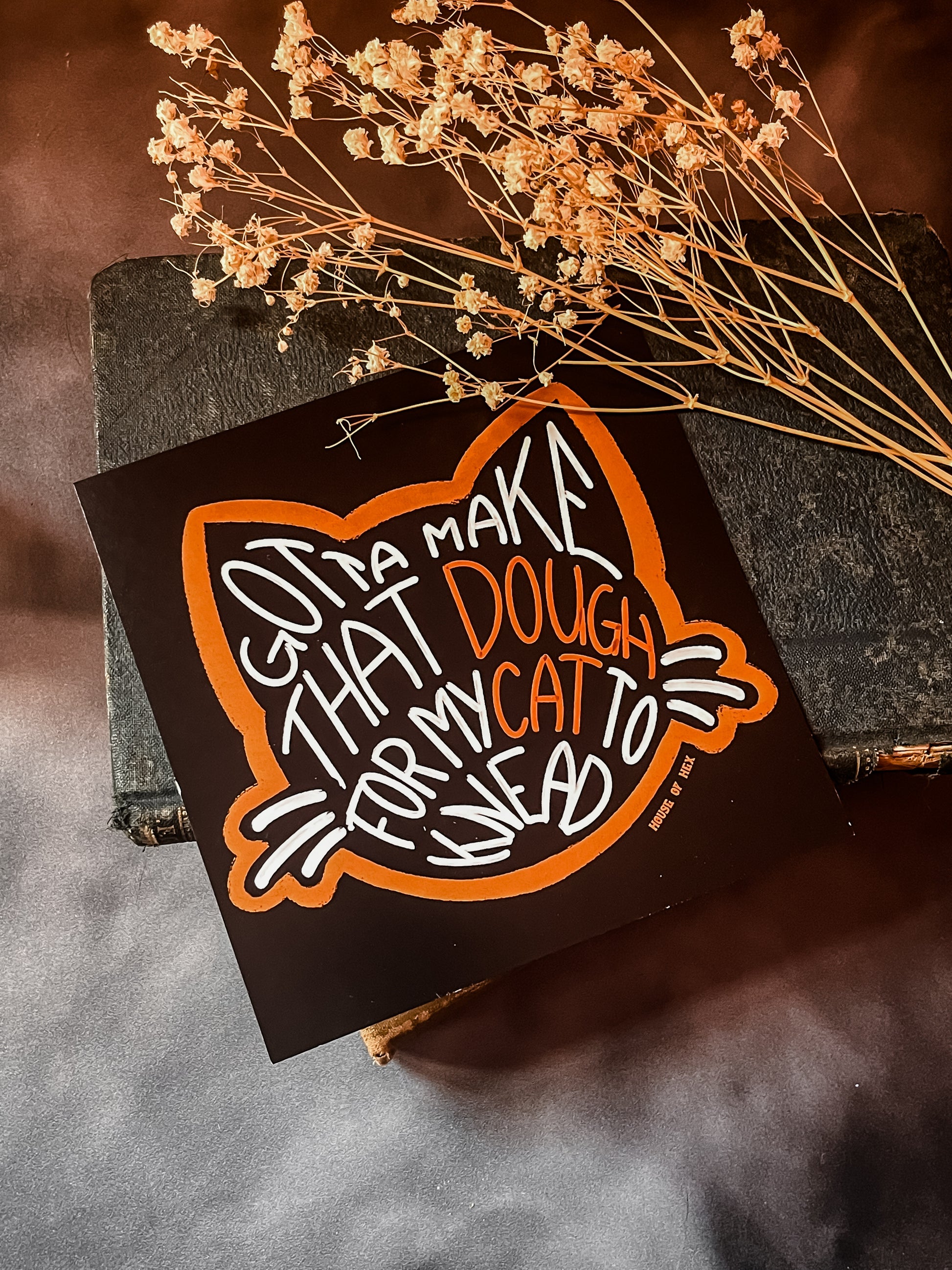 Print features the writing "Gotta make that Dough for my Cat to knead" pun on a black background.