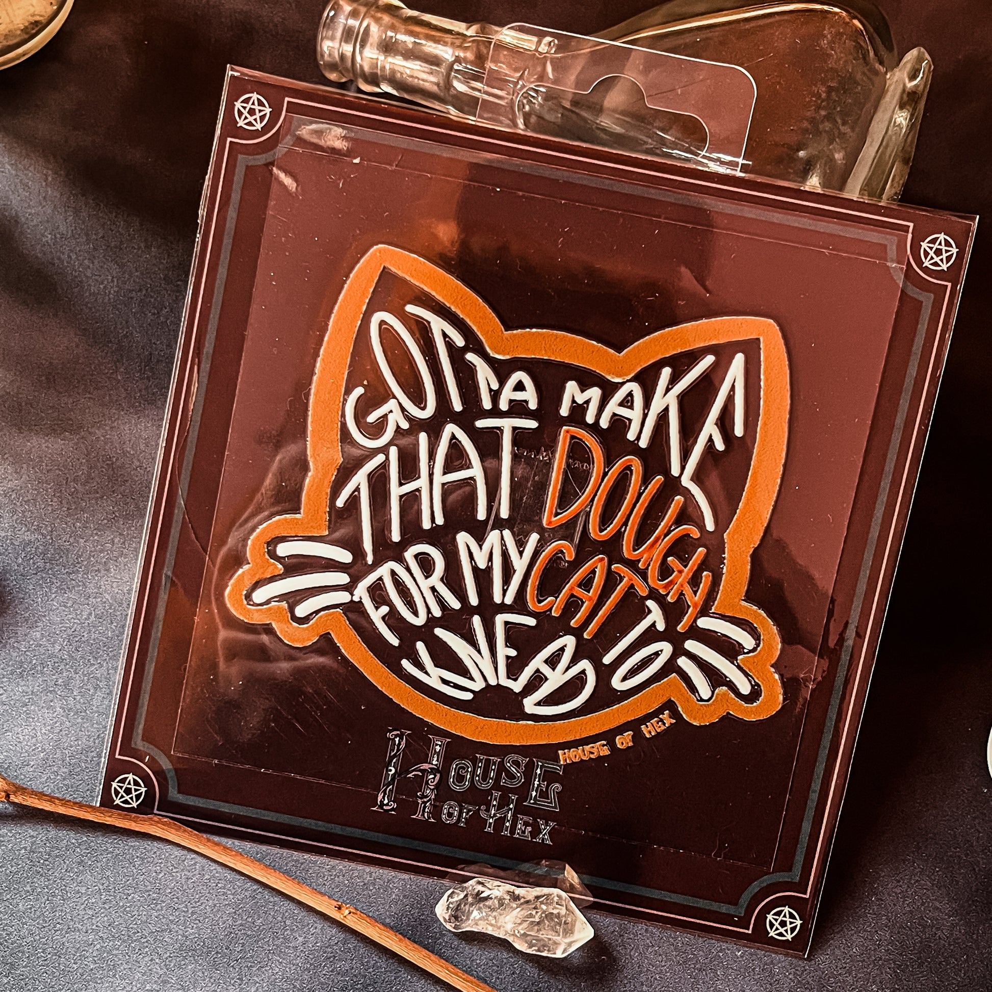Featuring a drawing of "Gotta make that Dough for my Cat to knead" design in the shape of a cat's head.